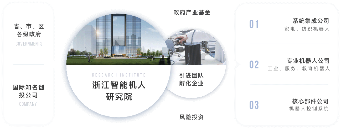 研究院依托浙江大學機器人研究中心和浙江省機器人產業發展協會合作的同時,吸收金沙江聯合資本、之江實驗室等多方位資源,并與聯盟成員單位及國內外其他機器人研究機構、知名機器人企業形成互補合作關系并取得多項成果,積極打造一個智能機器人產業技術平臺。